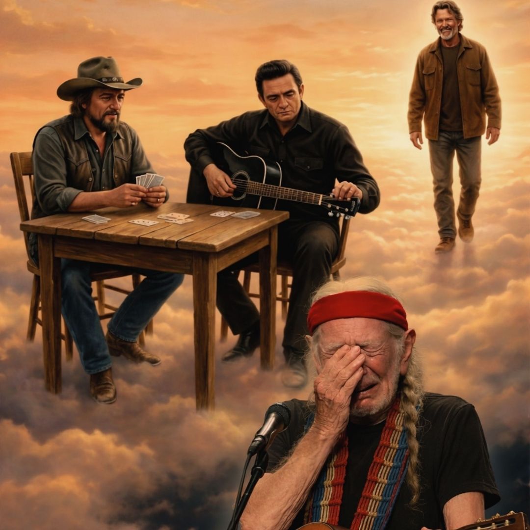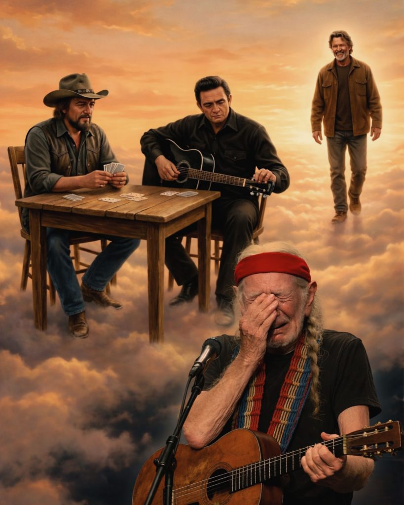 Soon after, a fan painting began circulating. Waylon Jennings sat at a weathered table in the clouds dealing cards. Johnny Cash adjusted the strings on his black guitar. In the distance, Kris walked toward them, smiling like a traveler returning to familiar company. Below, Willie Nelson remained alone on the road. The title — “The Highwaymen: Waiting for the Last Rider” — turned the image into more than tribute; it felt like a story continuing somewhere beyond view.